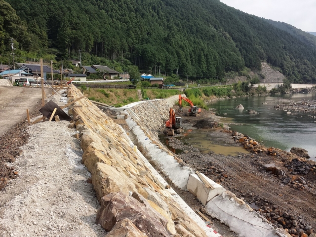 川の流れの力から堤防や川岸を守り、洪水を防ぐための護岸を設計します。川の流量や流速を計算し、それに対して安全な護岸の形状や堤防の高さを決定します。洪水時に堤防が決壊することを防ぎ人々の生命と財産を守ると共に、生物の生息地にも配慮した多自然川づくりに繋げます。