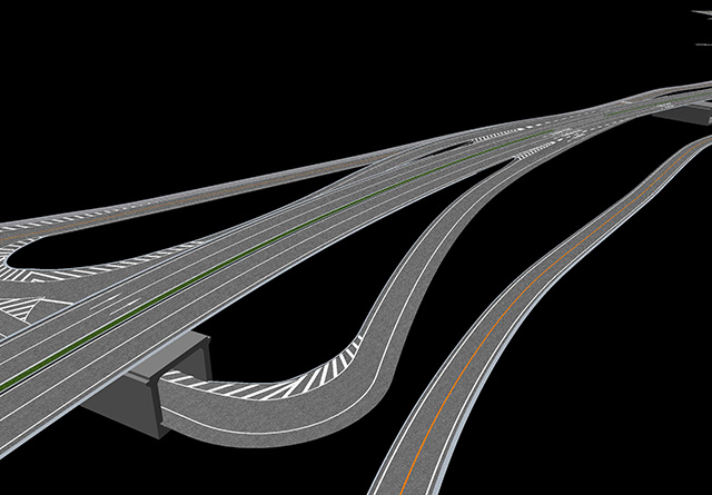 これまで2次元の図面で表現していた道路や橋、地形などを、コンピューター上に3次元の立体モデルとして構築します。